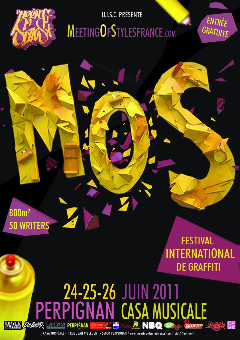 Un fond musical Hip Hop, un soleil de plomb, des couleurs à foison, des artistes débordant de talents…c’était Meeting Of Styles ! Le M.O.S France 2011, pour la deuxième édition, a eu lieu à Perpignan, les 24, 25 et 26 juin dernier, sous les yeux émerveillés d’experts, de curieux, de passionnés…